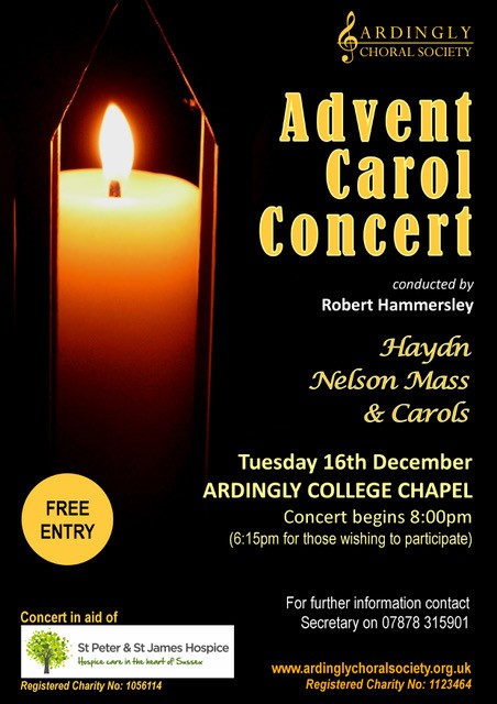 Our next performance is our Advent Carol Concert on Tuesday, 16th December 2025, which is FREE ENTRY. We hope that you will be able to come along to enjoy a festive evening of song and help us raise money for the St Peter & St James Hospice by donating on the night. If you wish to sing with the choir, just come to the rehearsal at 6.15pm on the day.